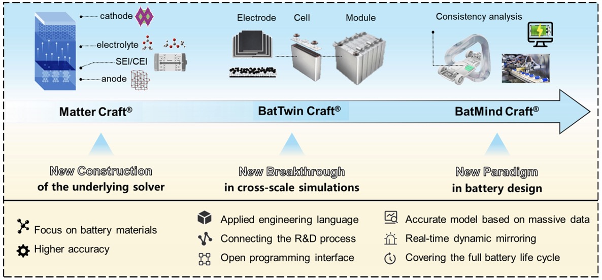 图4. 全栈BDA软件平台:材料工坊Matter Craft®、电芯工坊BatTwin Craft® 与智芯工坊 BatMind Craft®