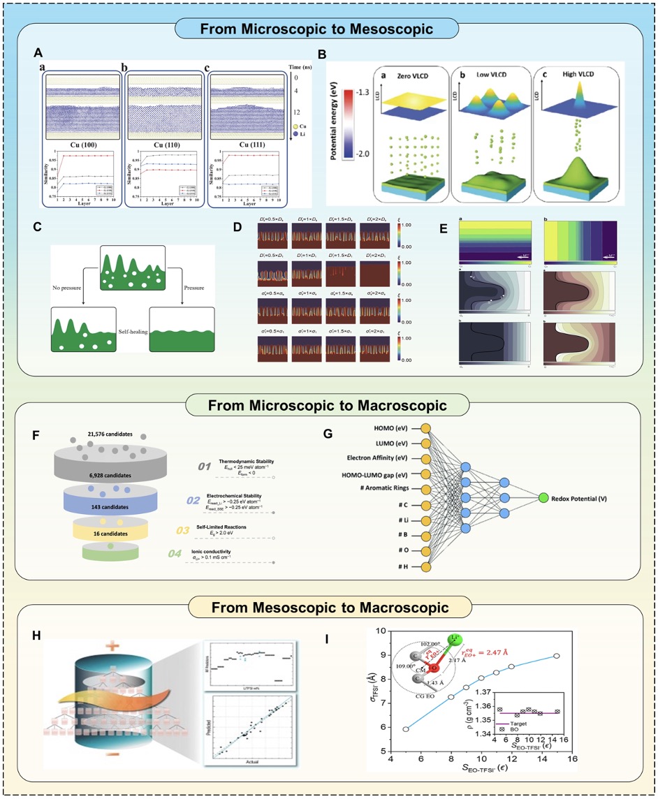 实现高保真模拟的关键在于将微观模拟获得的高质量参数无损传递至介观与宏观模型。研究显示,人工智能驱动的模拟,如机器学习力场(MLFF),不仅能揭示锂在不同晶面铜集流体上的沉积行为、枝晶的本征自修复机制以及外压抑制枝晶的微观机理,还能为介观相场模型提供关键的界面动力学参数,从而贯通电池的多尺度模拟。同时,高通量计算与筛选可以高效设计新材料(如新型正极和固态电解质材料),其本征特性(如离子电导率)可以用于定义宏观连续介质模型的材料参数。粗粒化分子动力学(CGMD)结合贝叶斯优化等方法,可以高效获取聚合物电解质等复杂系统的介观传输特性,为宏观性能评估提供输入。