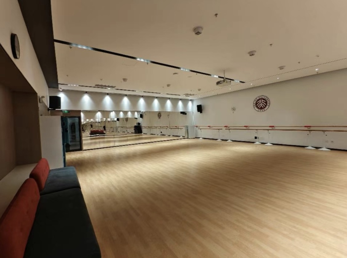 The dance studio comes with mirrors, barres, audio equipment, and a screen for dance and yoga practice.