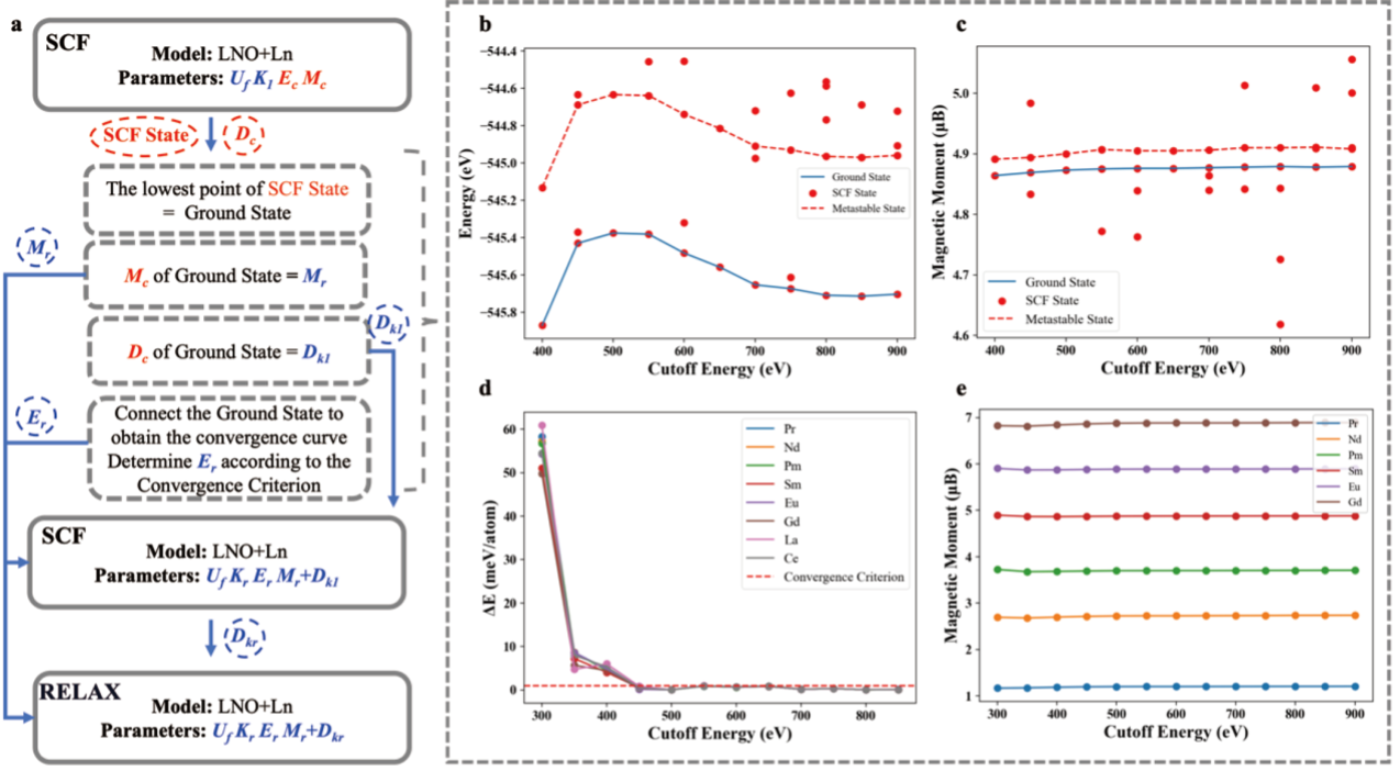The accuracy and stability of ground-state electronic structure calculations in theoretical models are intrinsically linked to their magnetic configurations. Conventional computational models typically converge to either high-spin or low-spin states during calculations, which are readily distinguishable due to their significant differences in both energy and magnetic moment values. Prof. Zheng Jiaxin’s group discovered that in LNO+Ln systems, the high-spin state exhibits lower energy. Notably, unlike conventional systems, LNO+Ln systems demonstrate a peculiar phenomenon where minute differences in magnetic moments can induce substantial energy variations of approximately 1 eV. This behavior originates from the existence of numerous metastable states near the ground-state electronic structure of LNO+Ln systems. These metastable states exhibit magnetic moment values nearly identical to the ground state (with only marginal differences), yet correspond to distinct 4f-electron configurations that result in considerable energy disparities. Consequently, during first-principles calculations, the computational models exhibit a tendency to converge to these metastable states rather than the true ground state. This leads to poor computational convergence and inaccurate simulation results, presenting significant challenges for theoretical investigations of LNO+Ln systems.