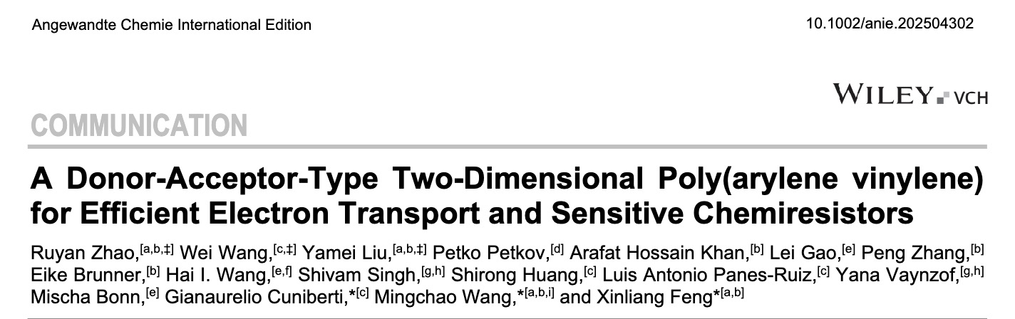 Recently, the research group led by Assistant Professor Mingchao Wang from the School of Advanced Materials Shenzhen Graduate School (SAM), in collaboration with the Max Planck Institute for Polymer Research in Germany, Dresden University of Technology, and Sofia University in Bulgaria, successfully developed a donor-acceptor-type two-dimensional poly(arylene vinylene) (2D PAV) material with a square lattice. This material exhibits electron-dominated transport properties and enables highly efficient detection of sulfur dioxide (SO2) at room temperature, with a detection limit as low as approximately 0.1 ppb. The research findings were published in the international academic journal Angewandte Chemie International Edition under the title “A Donor-Acceptor-Type Two-Dimensional Poly(arylene vinylene) for Efficient Electron Transport and Sensitive Chemiresistors.” .