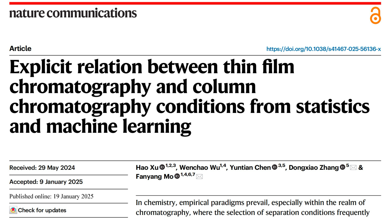 Recently, the team led by Fanyang Mo at the School of Advanced Materials (SAM), Peking University Shenzhen Graduate School, in collaboration with Dongxiao Zhang’s group at East China University of Science and Technology, reported a new advancement in the field of “AI for Chromatography.” By integrating statistical methods with machine learning, the researchers for the first time quantitatively revealed the relationship between thin-layer chromatography (TLC) and column chromatography (CC). The study proposed a novel knowledge-discovery approach and established an interpretable formula that transforms chemists’ empirical knowledge into “AI experience.” This work provides a theoretical foundation for determining and optimizing experimental conditions in chromatographic separation. The findings were published in Nature Communications.
