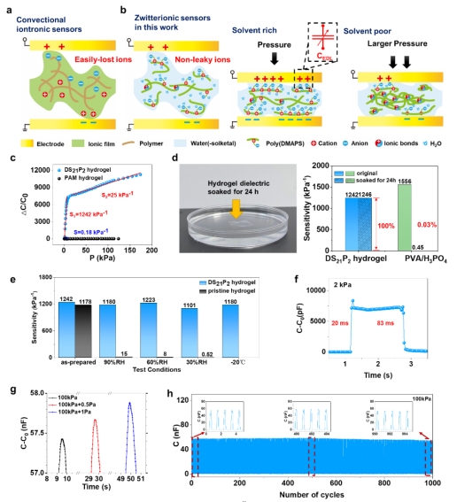 离电型传感器主要是利用EDL的超级电容特性来实现高灵敏度等特性。由于DS21P2水凝胶聚合物链上有许多锚定在聚合物链上的两性离子基团,且能够在广泛的湿度水平上含有相对稳定的水含量,所以能够产生丰富的自由离子,与电极形成EDL,因此将其双面微结构化后作为传感器的介电层。所得器件在多种环境条件下展现出优异的性能(灵敏度均>1100 kPa-1),更重要的是具备离子安全性,在浸泡24小时后性能毫无衰减。