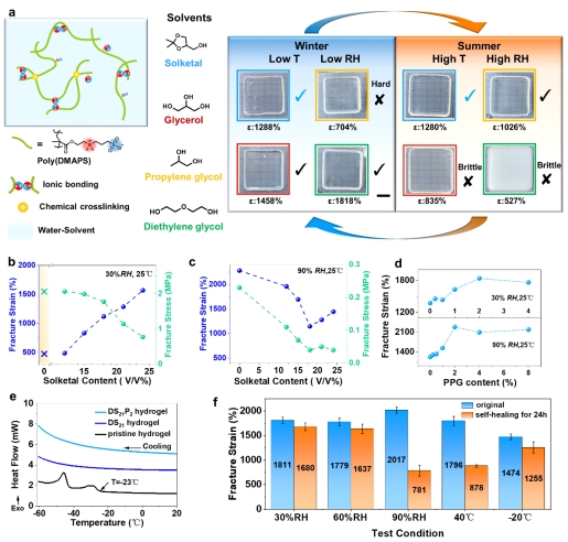 具体的,通过对含四种不同有机高沸点溶剂的聚DMAPS水凝胶进行对比分析,发现了含有solketal的水凝胶在多种环境下具备最优异的稳定性和可用性,特别是含量达21% vol.的情况下,水凝胶在潮湿和干燥环境下都具有一致的断裂伸长率(约1200%)。同时,由于solketal的独特特性,可以在不添加表面活性剂和小分子电解质的情况下加入疏水的PPG,在水凝胶内部引入疏水胶束结构进一步提高性能,优化后的DS21P2水凝胶在宽湿度和温度条件下都展现出优异的力学性能和可自愈性。
