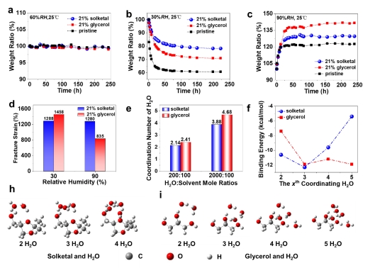 将solketal与目前最常用的甘油相比较,发现solketal水凝胶在宽湿度范围内展现出更好的含水量和性能稳定性。采用MD和DFT计算进行了原理解释,发现环境水分变化时,solketal分子结合的H2O分子数变化更少。这是因为,solketal-H2O体系对第2个H2O分子的结合能更低,这意味着solketal分子不太可能失去第2个H2O分子;solketal-H2O体系对第4和第5个配位的H2O分子的结合能更高,标志着在高湿度下会结合更少的H2O分子。因此,solketal水凝胶显示更好的环境稳定性。