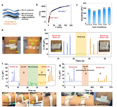 为了实现器件的可拉伸性和自愈性,将DS21P2水凝胶作为基底制备了高性能且可自愈的可拉伸电极。将电极与水凝胶介电层集成,得到可拉伸的高性能传感器。由于水凝胶的自愈性,该器件可直接佩戴在人体上,在50%应变下仍有响应。更重要的是,该器件的每一部分都可实现快速的自愈合,在实际使用中具有独特优势。