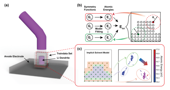 该工作基于能量拆分方法,在传统DFT计算结果中局域化拆分体系总能量,实现了端到端的机器学习力场模型构建。进一步的,在数据集生成过程中引入了隐式溶剂模型,通过机器学习力场实现了电解液环境下锂枝晶形貌的原位跨尺度分子动力学模拟。为了实现小尺度数据集到大尺度模型应用的跨越,文章提出了一套跨尺度主动学习方案,以及一种结合能量拆分方法的跨尺度模型准确性验证方法。上述方法为大尺度形貌问题的原子精度动力学研究提供了解决方案。
