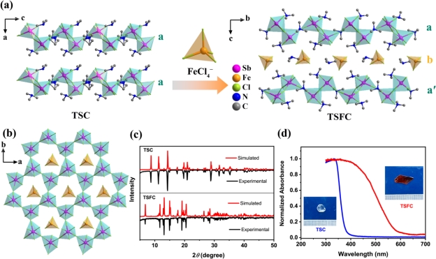 研究团队合成了一种A3M2X9型的层状钙钛矿材料(TMA)3Sb2Cl9 (TMA=trimethylammonium),简称为TSC。其层间为较弱的分子间作用力,因而可以实现多种离子的嵌入,而层内则由SbCl6八面体通过点连接的方式形成一种类蜂窝状的结构。TSC的空间群为2/mFm,表现出单轴方向的铁电性,且不表现出铁弹性。实验测得极化率为1.76 μC/cm2,与基于密度泛函理论的Berry相计算值2 μC/cm2吻合。压电响应力显微镜结果进一步证实了TSC具有良好的铁电性。