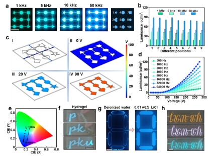 一个是信息加密器件。加密的信息需要满足以下两个条件才能显示:给器件施加交流电;将器件浸入极性液体中,例如自来水中。与普通的紫外加密相比,该加密装置具有更新颖、更好的鲁棒性、可编程性和简易制备等优点,可广泛运用在军事加密、商品防伪以及水下光通信等领域。