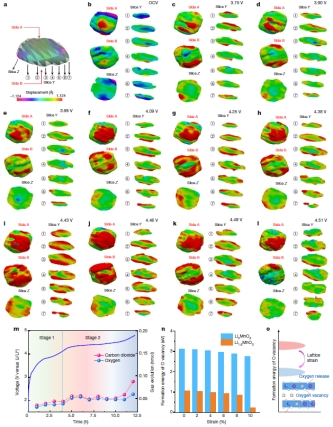 图1 LMR首次充电过程中的晶格应变演化过程及其与氧流失的关系