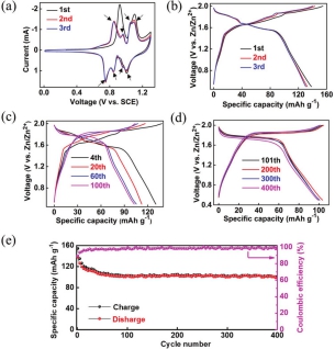 李锐课题组与郑家新课题组通过原位/非原位XRD、元素分析(EDS、ICP)以及理论计算等手段,首次证实了普鲁士蓝材料K2MnFe(CN)6在存储Zn2+时,Zn2+插入加剧K2MnFe(CN)6相内部的Jahn-Teller效应,同时参与反应形成新相,从而使不稳定的单斜K2MnFe(CN)6相转变为稳定的适合储存Zn2+的菱方K2Zn3[Fe(CN)6]2相。相变后的锌离子电池实现了100 mAh g-1的稳定放电容量和稳定长循环。该研究成功揭示了普鲁士蓝类正极材料储锌的真实相变机制,相关成果于近日发表在学术期刊《Advanced Energy Materials》(Adv. Energy Mater. 2021, 2003639,影响因子:29.368)上。