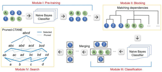 知识图谱是由相互连接的实体以及相关的属性组成的,高精度地实体消歧(如何准确确定文章的作者)是准确构建知识图谱的前提,判断知识库中的同名实体(同名同姓是否是同一个人)是否代表不同的含义以及知识库中是否存在其他命名实体与之表示相同的含义是一个重要的任务。在材料知识图谱中,作者的歧义化是知识库构建的主要障碍之一,同名以及相似姓名变体的作者经常会被混淆,常造成信息的搜索或关联错误。因此,基于作者信息以及文本信息,团队结合机器学习和依赖匹配算法对材料知识图谱中的主体(作者)进行高精度消歧,并引入剪枝策略以解决在面对庞大且复杂的数据时查找效率较低的问题,实现高效信息匹配和搜索,从而构建了MatKG的框架(图2)。