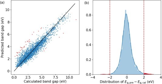 在该工作中,团队通过自主建立了一个包括HSE计算数据的材料结构数据库,并基于此通过机器学习的方法对材料结构的带隙进行学习,并展示了机器学习是如何被用来作为一种工具来挑选这些不寻常的案例,以及如何用传统的分析方法来研究这些不寻常的案例,从而拓宽已有的科学知识。在该工作中,团队只使用了相对较小的数据集进行训练,并且ML模型的总体性能与已有的工作相当,模型R2约为0.89。通过观察带隙预测模型的结果,团队从数据库约4000种化合物中确定了34种不同寻常的“例外”化合物,在具体的分析之后,其中许多化合物具有不寻常的结构或其它异常,如特殊的配位环境或氧化态,带隙相对于同族其它化合物的突然增加,或是同族不同化合物之间的不同相结构。