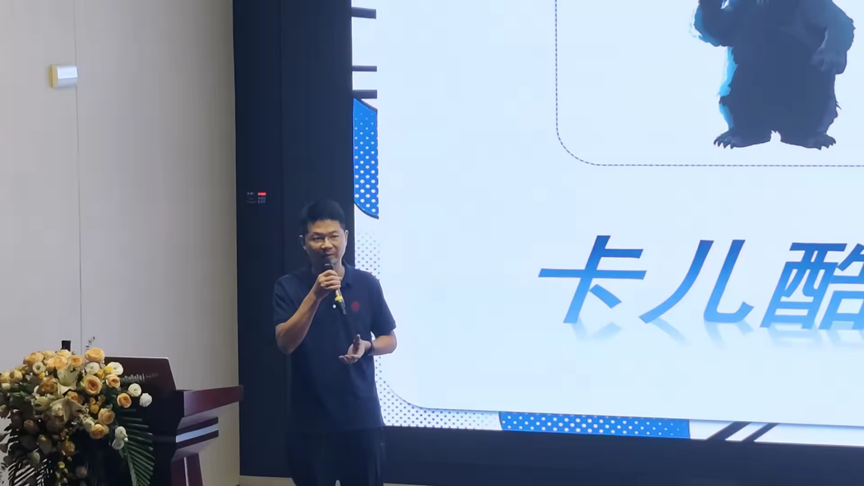 参观结束,进入校企共建交流环节。卡儿酷科技有限公司董事长雷云校友讲述了自身的创业故事,介绍公司的发展历程、核心科技与产业布局,分享了自己从电子游艺
