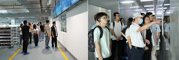 随后,师生前往卡儿酷科技有限公司战略产品线及实验室进行参观。在实验室工作人员的带领下,先后参观了储能车间产业线、SMT车间产业线、启动车间产业线及电芯装配实验室。实验室人员重点介绍了在实际生产中锂电池正极、负极和电解液的装配流程即可能存在的技术难题,并与同学们交流平时做实验时的一些技术细节。
