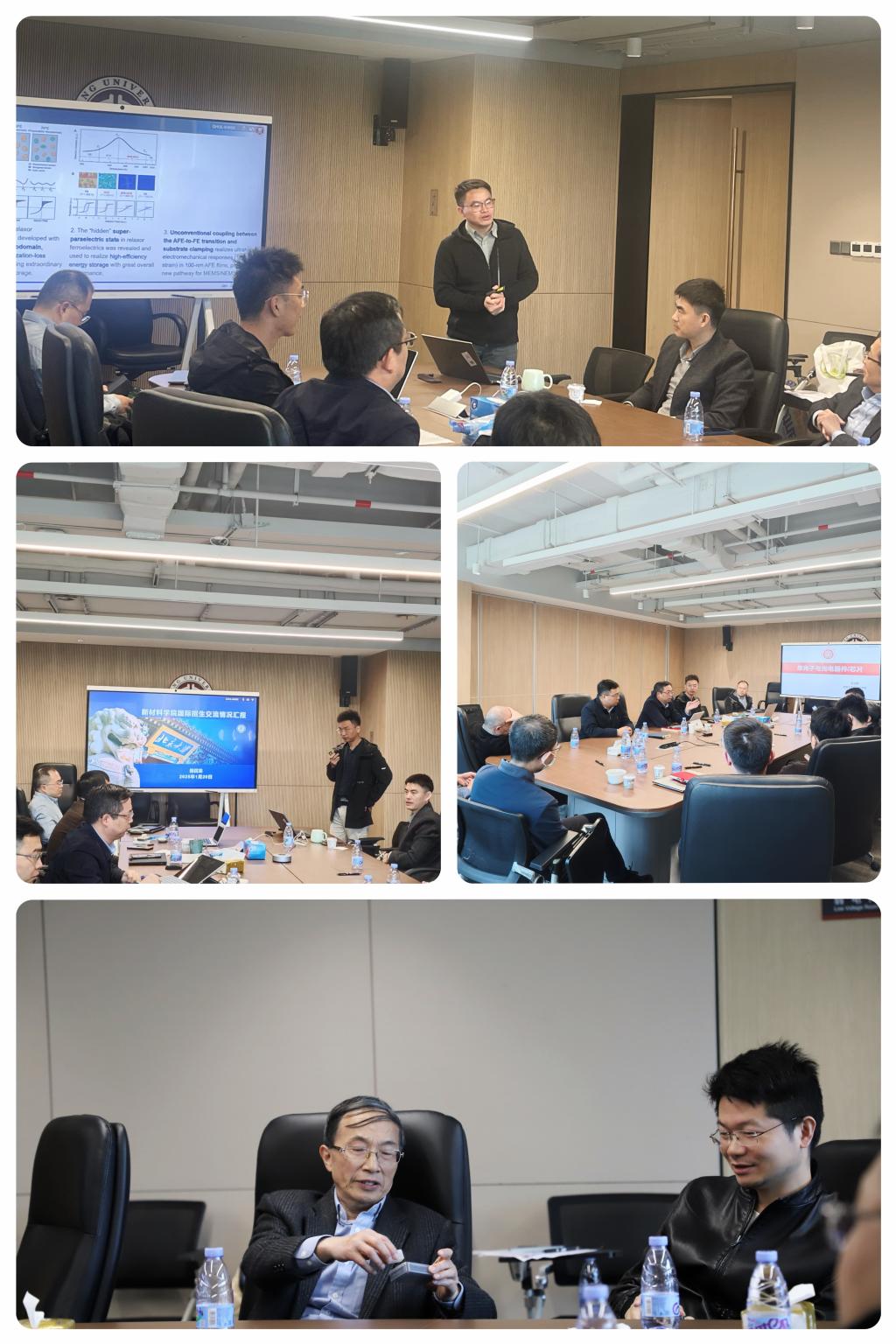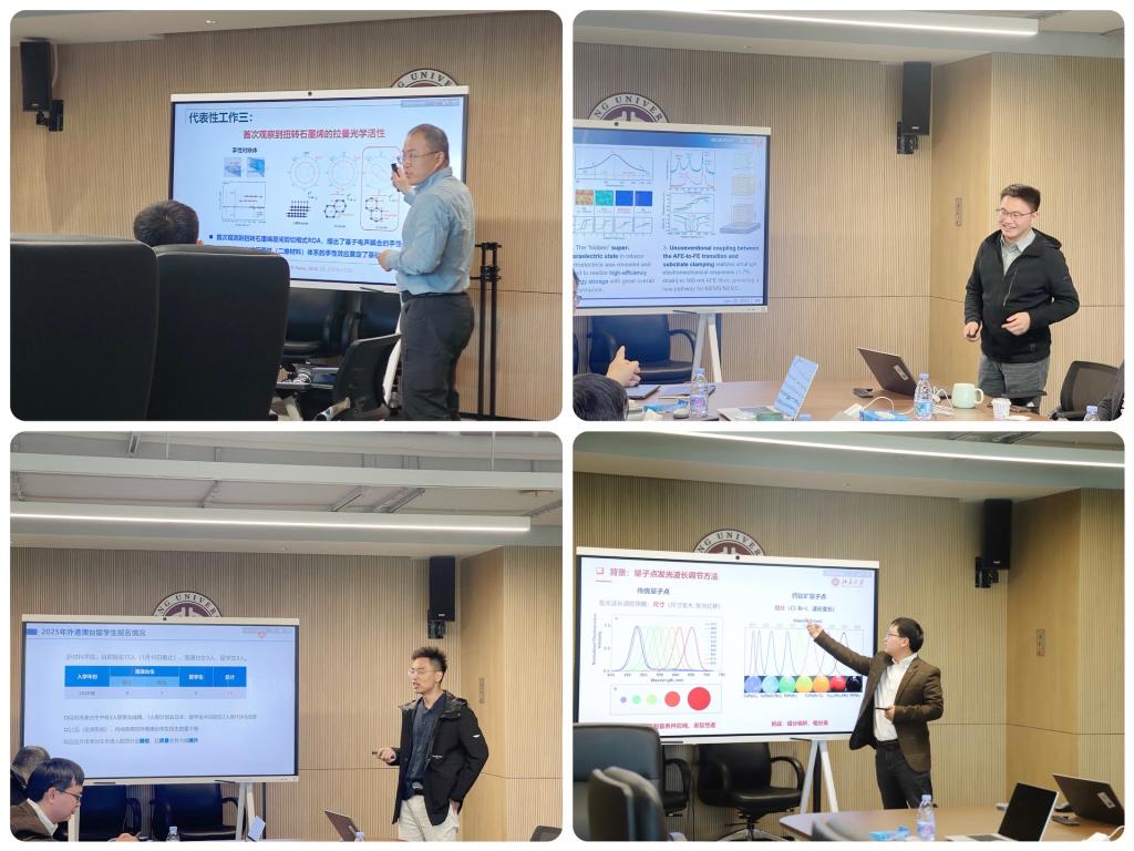本次教师交流会共有四个主题,分别由新材料学院新引进青年教师-助理教授童廉明博士、潘豪博士、陈召龙博士和王立刚博士分别作精彩的报告。首先,童廉明老师分享了AI赋能的材料谱学表征技术的最新进展,他详细阐述了如何利用人工智能技术提升材料表征的准确性和效率。其次,潘豪老师带来了铁电薄膜材料的研究与应用方面的报告,深入探讨了铁电薄膜在电子器件中的潜在应用。陈召龙老师就学院国际留学生招生工作的现状与未来发展方向进行了阐述,他分析了当前国际招生的形势,并提出了未来的发展战略。最后,王立刚老师报告了单光子与光电材料的研究进展,展示了该领域取得的突破性成果。
