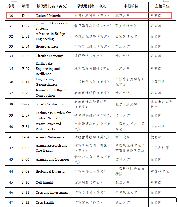 材料科学与工程学院自主创办的《National Materials》入选中国科技期刊卓越行动计划高起点新刊项目。