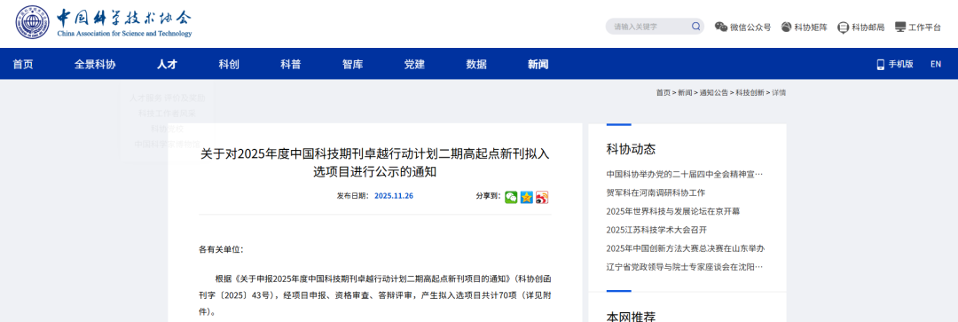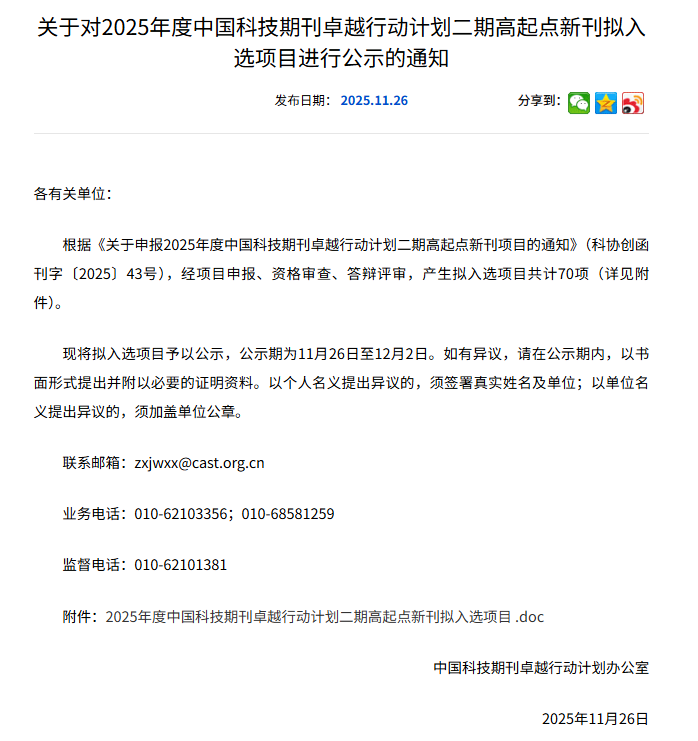 近日,中国科技期刊卓越行动计划办公室印发《关于对2025年度中国科技期刊卓越行动计划二期高起点新刊拟入选项目进行公示的通知》,通知指出经项目申报、资格审查、答辩评审,产生拟入选项目共计70项。其中,电子游艺