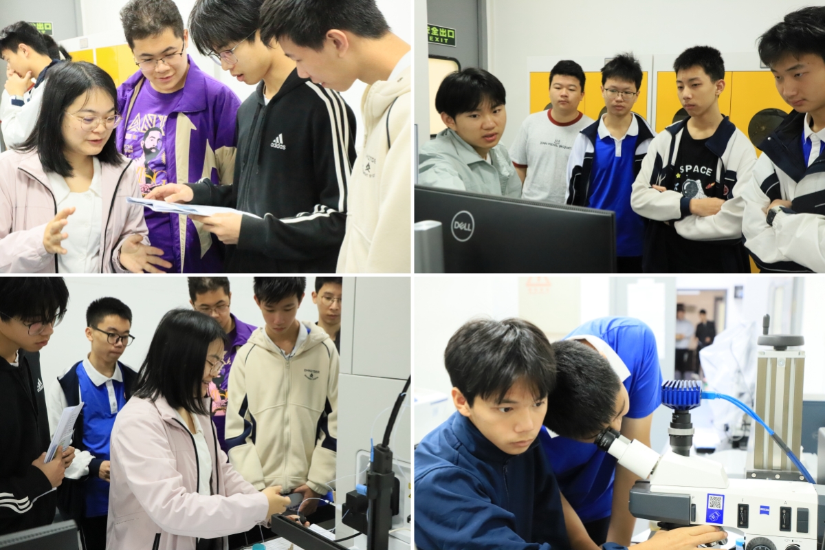 活动中,学院分析测试中心李曾林老师与志愿学生王娴雅、黄程熠为来访师生进行专业讲解。围绕材料结构与性能分析,同学们系统了解了光学显微镜、X射线衍射仪、电感耦合等离子体质谱仪等大型科研设备的工作原理与应用场景,在真实科研环境中近距离感受物理学原理与材料前沿研究的深度融合。