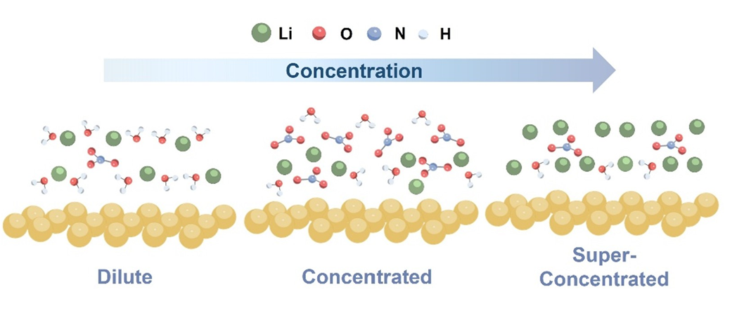 为深入解析界面微观结构,研究团队结合分子动力学模拟(MD)与从头算分子动力学(AIMD)方法,构建了电极/电解液界面的原子模型。在最佳浓度与工作电位下,界面区域呈现出独特的双层有序结构:下层为有序的3Li⁺·NO₃⁻平面,其中Li⁺的配位作用削弱了N-O键,降低反应活化能;上层为垂直取向的NO₃⁻,通过与水分子形成氢键显著提升了H₂Oₙ=₂比例。如图2所示,浓度效应进一步验证了该机制的普适性。值得注意的是,该机制在稀释或过高浓电解液中均无法有效形成:前者因离子数目不足,后者因Li⁺水化链锁定水分子网络。