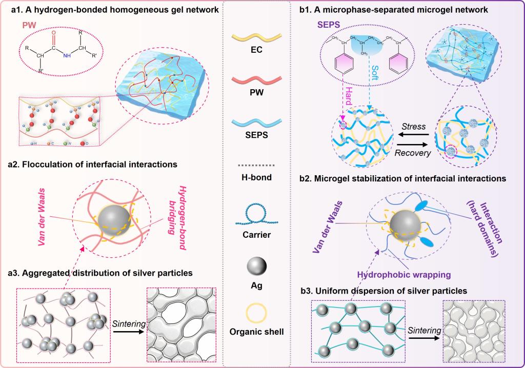潘锋团队近日取得重要研究进展。该工作通过引入苯乙烯-乙烯-丙烯-苯乙烯嵌段共聚物(SEPS)作为触变剂,解决高银含量下银颗粒聚集难题,同步改善银粉分散性,实现高分辨率印刷并提升电极导电性能。研究发现,SEPS依托硬段与软段的协同作用构建可逆弹性微凝胶网络,完成对体系界面结构的动态调控。其中,硬段作为结构骨架,可与银颗粒表面有机层通过范德华力、静电相互作用及疏水相互作用实现强界面吸附,有效隔离银颗粒、削弱颗粒间引力并抑制团聚,显著提升颗粒分散性。软段则在界面处形成柔性调控层,在剪切作用下发生链段重排赋予体系剪切变稀特性,且在剪切停止后可快速恢复体系黏弹性。该工作实现了有机-无机界面的动态调控,在促进银颗粒均匀分散的同时,显著优化银浆流变性能与烧结后电极电学性能。该策略成功将聚合物分子结构与宏观性能相关联,为印刷电子、光伏电极及高精度微器件用多相导电浆料的设计提供了通用化思路。