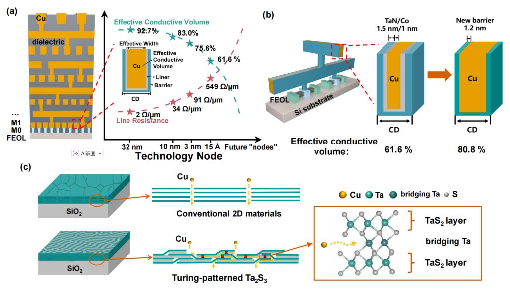 图1. 图灵图案化Ta2S3超薄扩散阻挡层的结构设计与先进Cu互连应用示意图