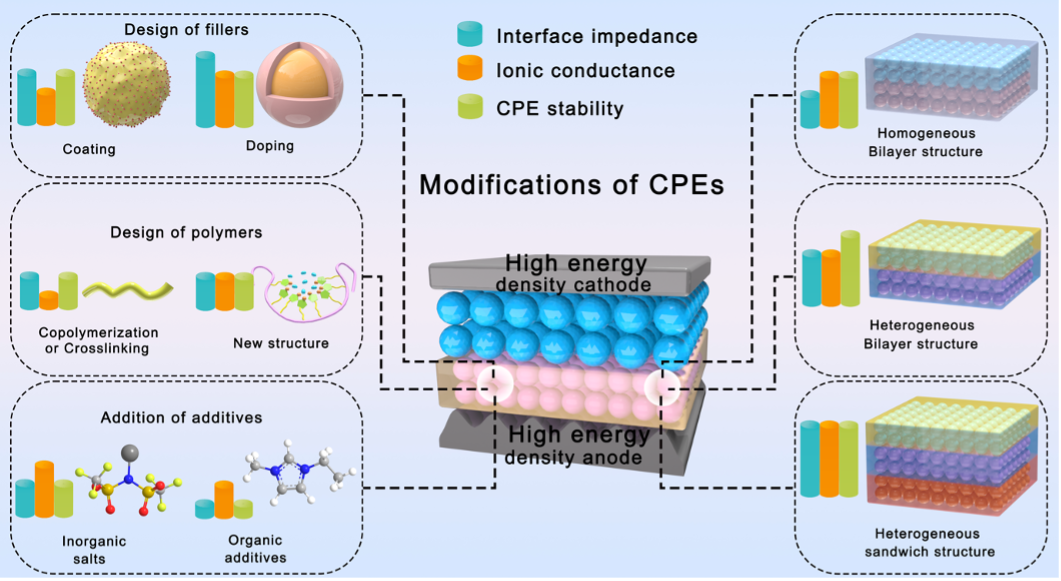 聚合物复合电解质(PCEs)在提升电池安全性、稳定性和能量密度方面具有显著优势,是实现高能量密度储能系统的关键材料之一。然而,PCEs在实际应用中仍面临严峻的界面挑战,尤其是在高电压或高能量密度体系中,界面不稳定、副反应频发及界面相容性差等问题更为突出,严重制约了离子传导效率与电池整体性能。因此,系统分析高能量密度条件下的关键技术瓶颈,并提出针对性解决方案,对推动下一代储能系统发展具有重要意义。尽管已...