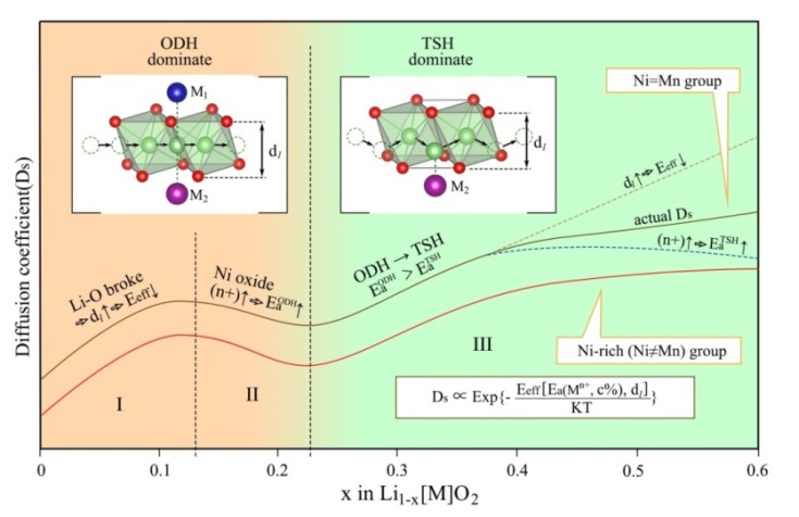电子游艺博士后郑家新及硕士生韦屹和崔岁寒在潘锋教授的指导下通过理论计算和实验测量,首次系统和完备地揭示了三元层状正极材料的锂离子是如何脱出的输运机理。