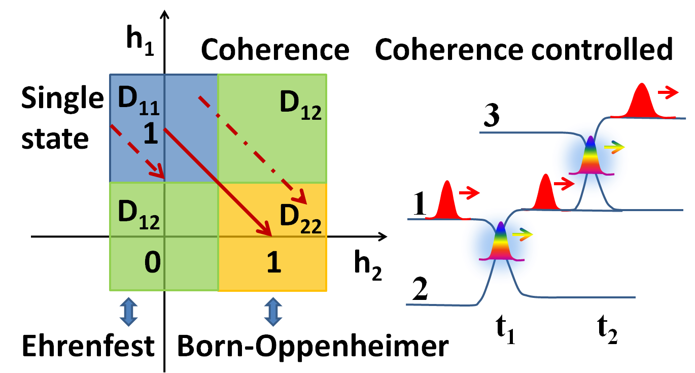 在前期工作的基础上, 电子游艺 陶国华副教授近期开发了一种非绝热动力学新方法-相干控制方法[coherence-controlled]。该方法基于经典电子态空间和全电子矩阵之间的映射以及分解态空间和不同