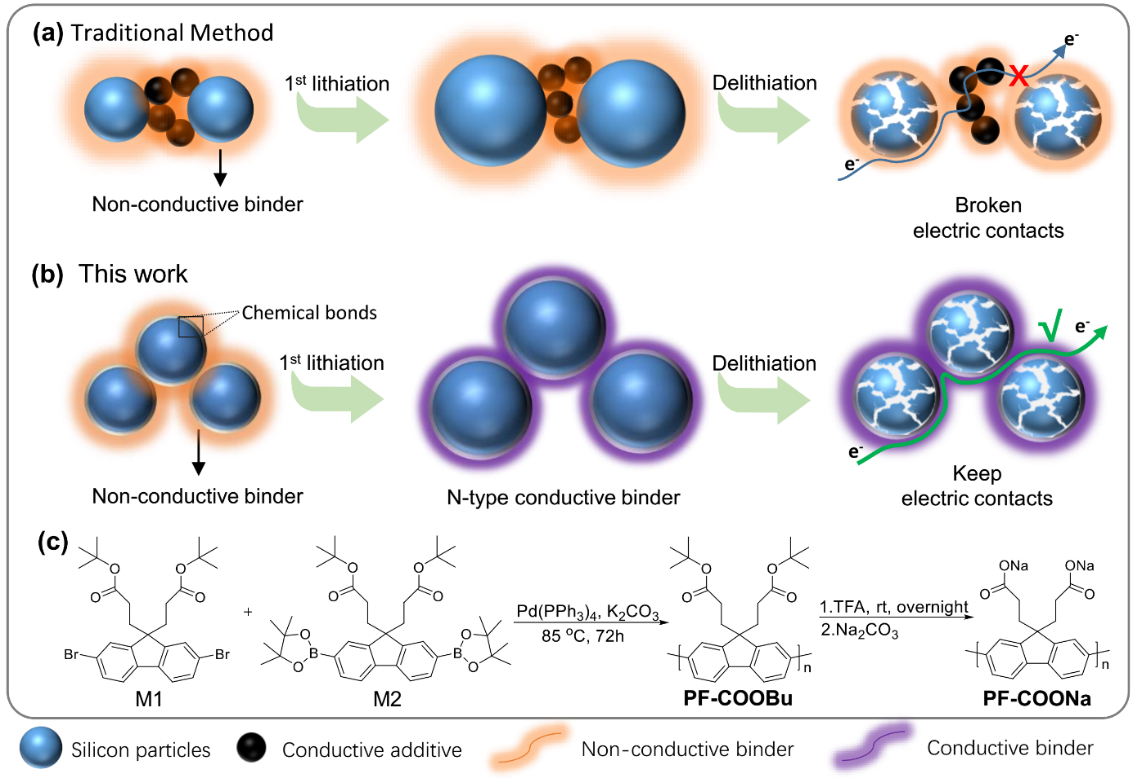 潘锋教授课题组在锂离子电池新型导电粘结剂领域取得重要进展,开发了一种新型的锂离子电池导电粘结剂,该粘结剂可以替代传统的导电粘结剂体系(PVDF+炭黑),显著改善高容量硅负极的循