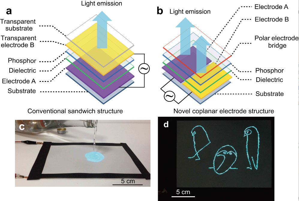电子游艺 有机光电材料器件课题组孟鸿教授团队提出了共平面电极结构——将需要施加交流电的两个电极置于同一层,再在平面电极上方覆盖上介电层和发光层,创造出一种全新型电致发光器