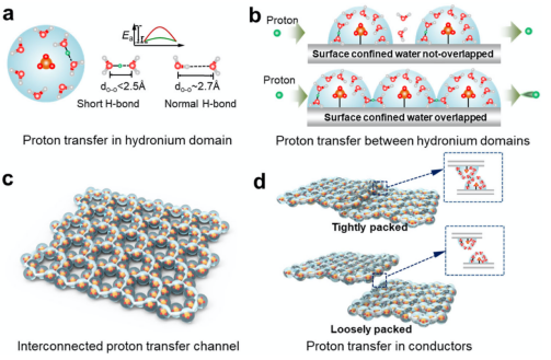 氢键是一种以氢原子为媒介的分子间相互作用。当氢键中给体(donor)和受体(acceptor)之间的距离足够小时,质子在两者之间将会以近乎无能垒的方式进行传递,此结构称为“短氢键”。在质子交换膜中构建短氢键网络将有利于质子的快速传导,而这其中最关键的两个问题是如何引入短氢键以及如何保证短氢键网络在膜上的连通性。共价有机框架(COF)材料为这种设计提供了一条可行的途径:通过COF表面的离子基团促使水分子限域从而形...