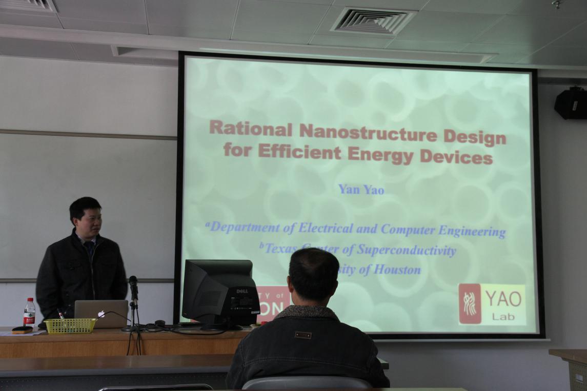 2013年12月19日下午,美国休斯顿大学姚彦教授受邀来访电子游艺 (深圳研究生院)并在C栋214为在校师生带来了一场题为“高效节能设备的纳米结构设计”(“Rational Nanostru